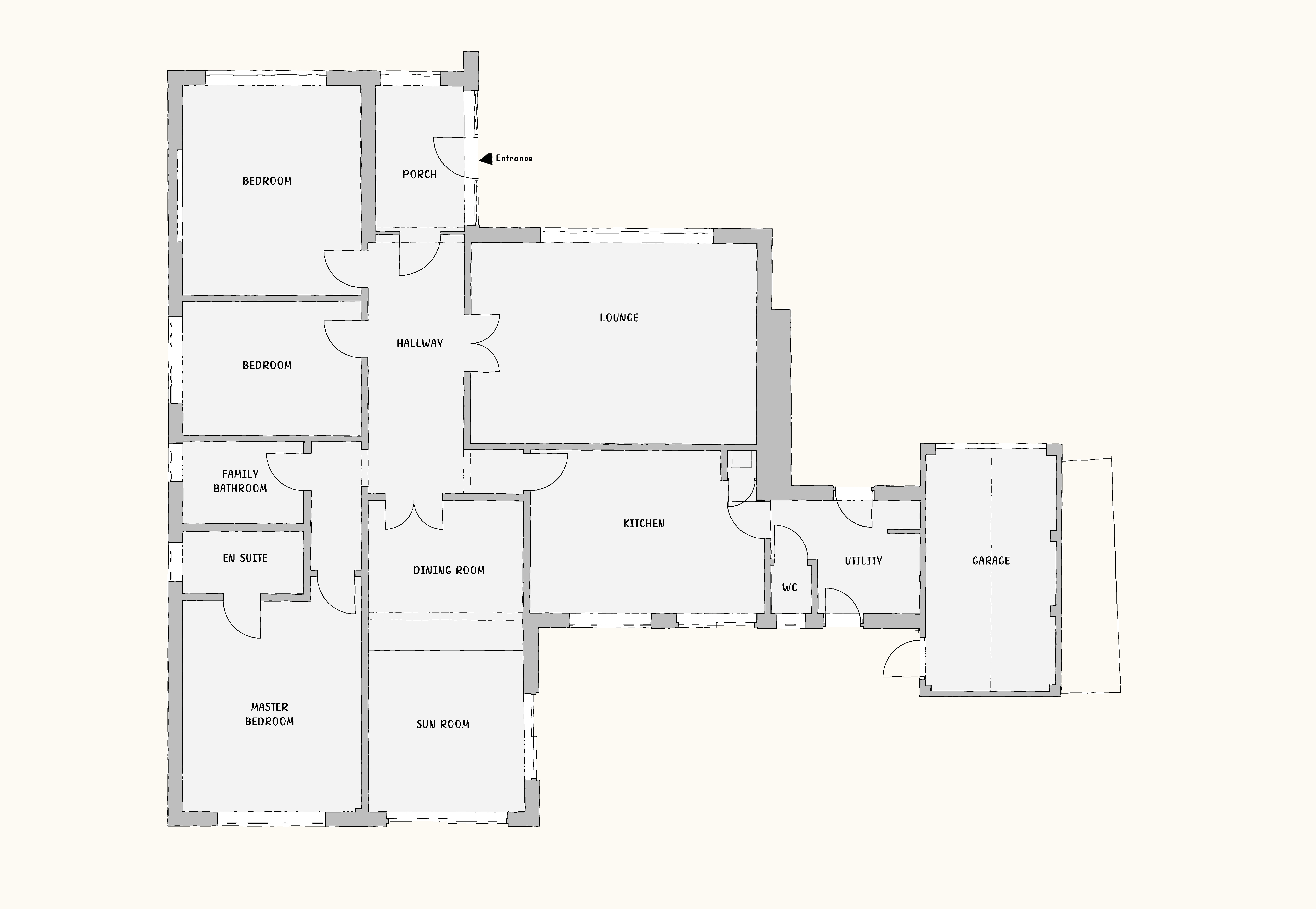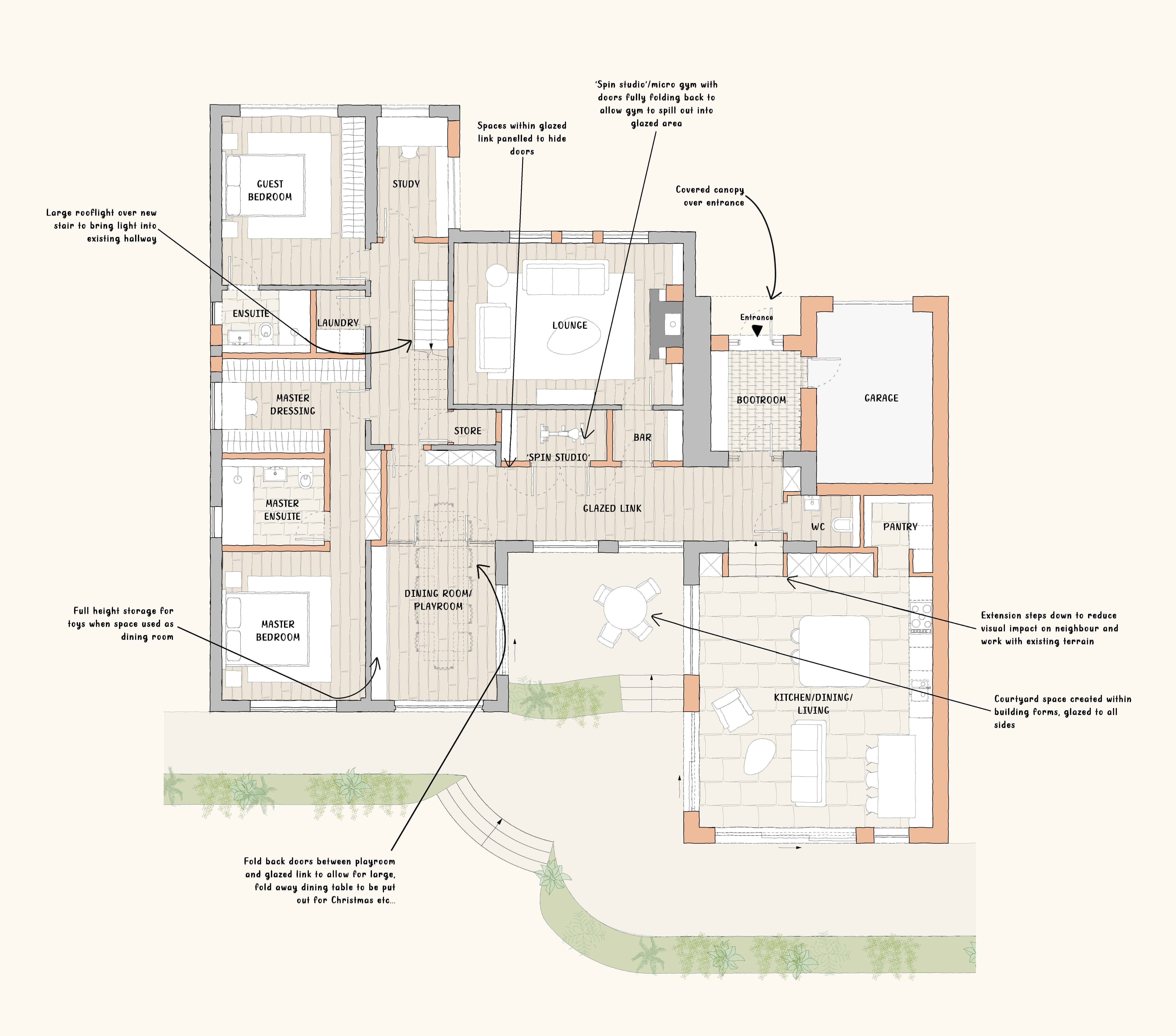 Stepping down from the existing bungalow, the extension sits naturally within the landscape, while a loft extension—currently under development—will add extra living space.